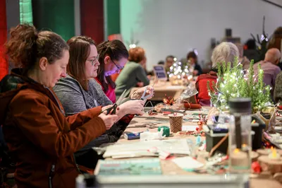DIY Elke dag kun je aan de workshoptafels onder leiding van kunstenaars en creatieven iets voor jezelf of een ander maken. Bij de tafel van de Bibliotheek kun je een kerstbal plotten, bij AKI-studentes kun je een keramieken kersthanger beschilderen of maak een kersthanger van kleurige kralen.